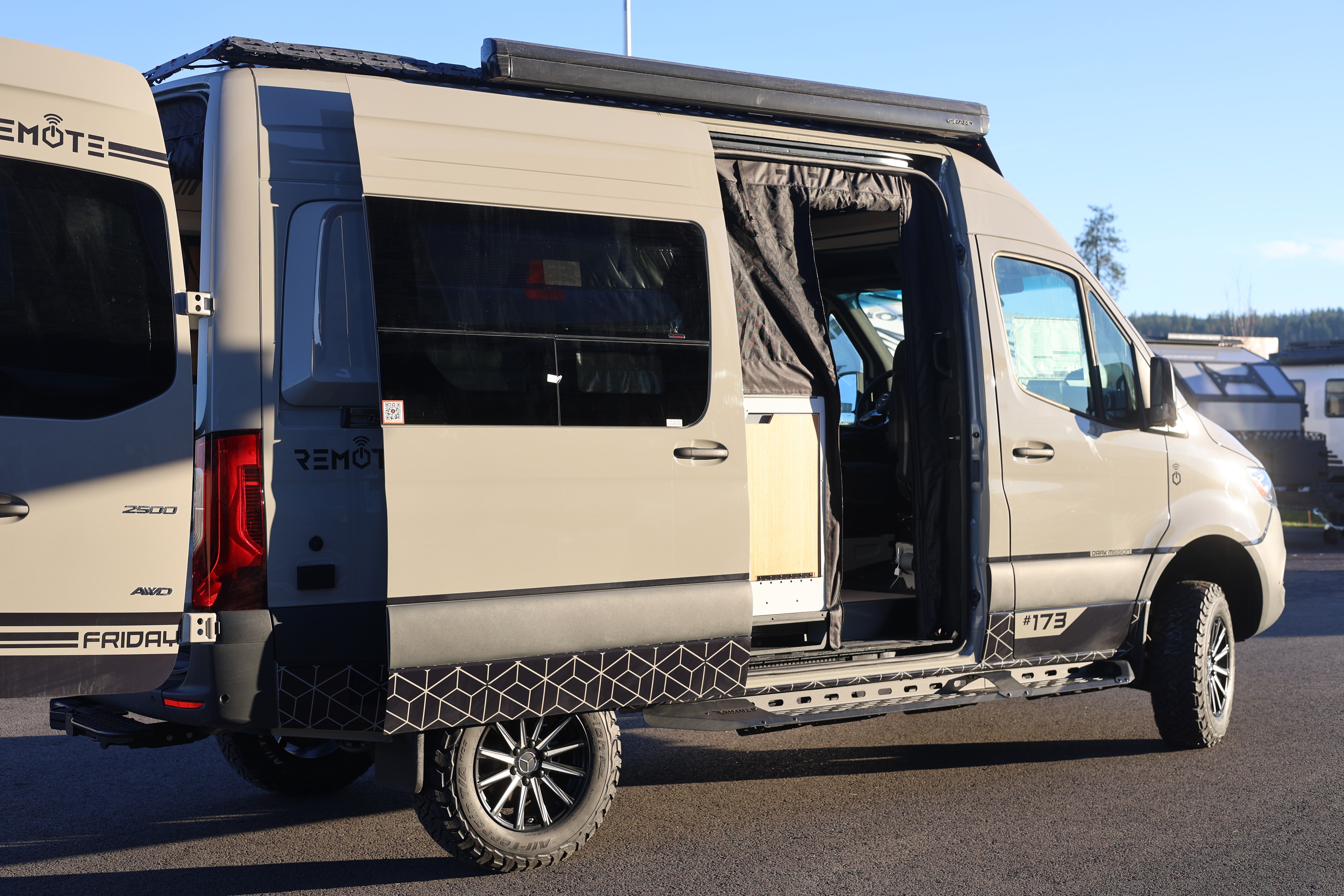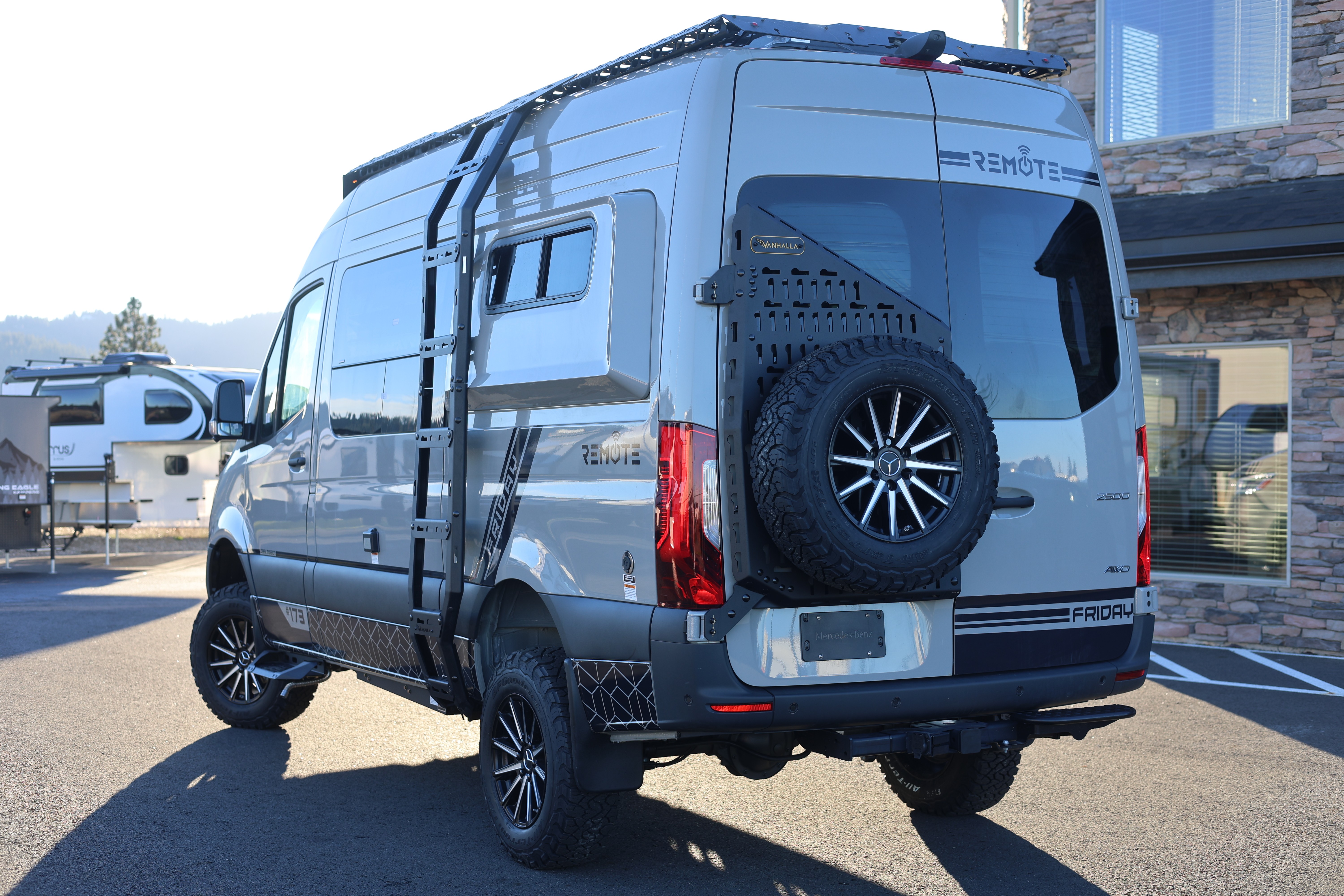 The champion of small and grand expeditions. Whether a quick ice-cream trip with the family, a weekend adventure, or full-time life on-the-road, our Friday® Series has you covered. Geared for the ultimate American roadtrip, and for those who want the ability and freedom to customize their vans over time. It is a stylish, impeccably built Adventure Van. The Friday® Series includes a 51V Lithionics power system with 16.8kWh battery storage, ultra-lightweight, aluminum kitchen, Starlink™ mini, internal Cyber Shower with recirculation feature, queen-sized legless bed and the Vanhalla™ Seat: a 90 degree, swing sleeper-seat. The van comes kitted with premium Adventure Van accessories from Vanhalla Overland and sports the Van Compass™ Heavy Duty Opti-Leaf Springs.